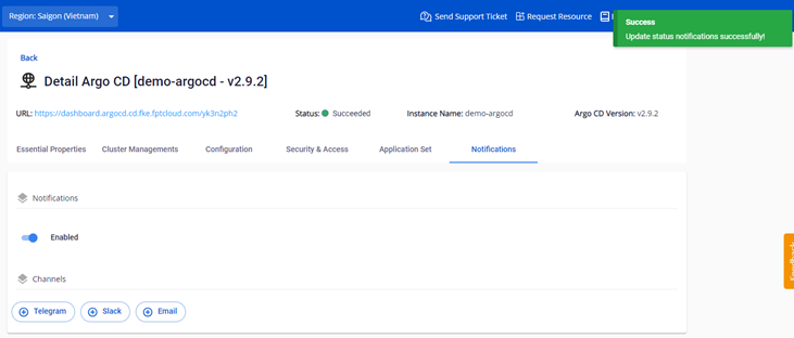 fpt-argocdEnable Disable NotificaionsEnable Disable Notificaions Bước 1 : Tại màn hình Notifications > Enable Notifications : Bước 2 : Sau khi enable thành công, FPT Cloud sẽ cho phép người dùng cấu hình thông báo tới một số hệ thống bên ngoài như Telegram/Slack/Email
