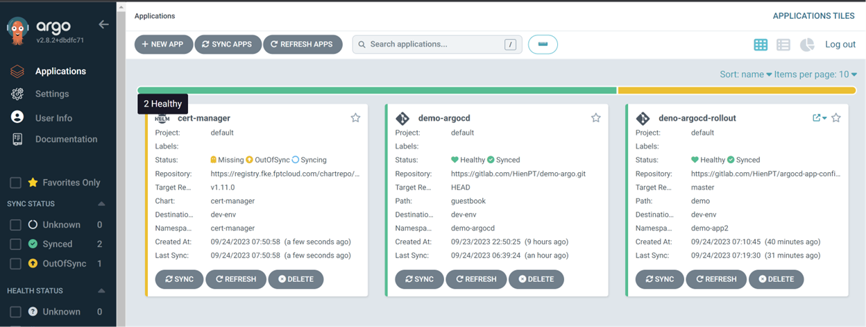 Bước 1: Cấu hình repository helm chart Cấu hình helm repository, trường hợp helm chart public có thể không cần cấu hình helm repo, tuy nhiên nếu helm chart private cần cấu hình helm repo để ArgoCD có thể get repository deploy ứng dụng. Ví dụ add helm repository của xplat tới ArgoCD Kết quả cấu hình thành công repository: Bước 2: Tạo Applications để deploy chart cert-manager Kết quả sau khi deploy applications: Kiểm tra kết quả deploy dưới k8s cluster: Lưu ý : Trong trường hợp deploy applications sử dụng helm chart deploy, argocd sẽ lấy file chart về để deploy như manifest. Do đó dưới cụm k8s cluster khi get list helm chart sẽ không thấy chart deploy.*