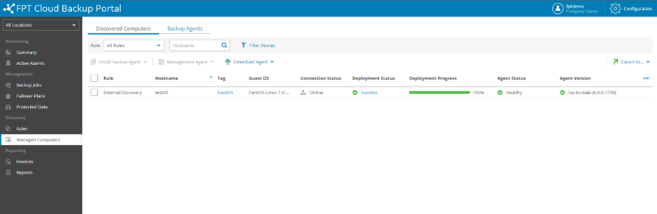 Bước 1 : Trên server cần backup, login vào trang portal với account của bạn: Backup as a Service : https://baas.fptcloud.com file Đây là giao diện quản trị của bạn sau khi login thành công: file Bước 2 : Vào mục Managed Computers chọn Download Agent sau đó chọn Linux. file Chỉnh thời gian Token hết hạn theo nhu cầu. Mặc định là 12 Tháng. file Bước 3 : Sau khi download thành công file LinuxAgentPackages.sh bạn cần copy vào trong server và tiến hành cài đặt. Chạy lệnh sau: