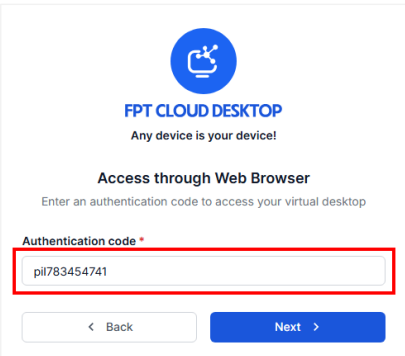 Thông tin URL này do quản trị viên khách hàng cung cấp Truy cập đường link dịch vụ bằng trình duyệt web, chọn Access through FPT Cloud Desktop Client file 2.Đăng nhập vào Authenticator (Server) phù hợp 1.Nếu người dùng truy cập bằng URL đã chứa authentication code hợp lệ (ví dụ URL chứa code hợp lệ: pil783454741.pilotfcd.online)