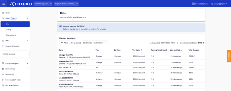 • Hệ thống sẽ trừ tiền chi phí sử dụng storage trong 1h ngay khi thay đổi.