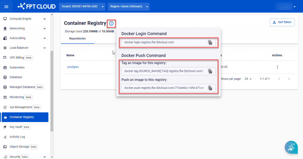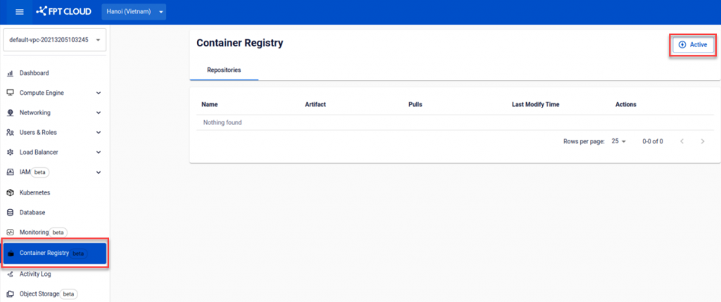 If you are the owner of the Tenant or the IAM user who is authorized to use the FPT Container Registry, you can activate the service on the FPT Cloud Portal.