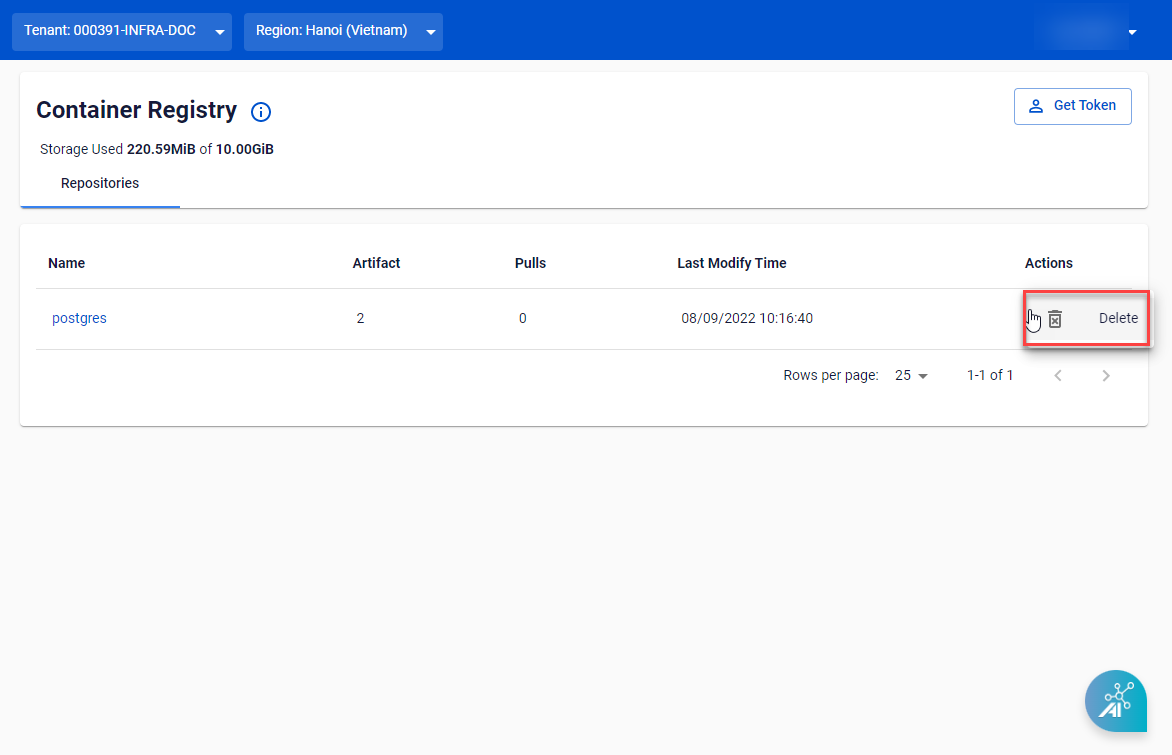 Step 1 : Navigate to the Container Registry page > from the drop-down menu in Actions > click Delete.