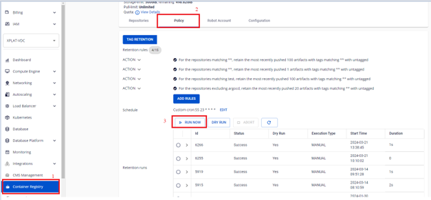 Người dùng có thể quản lý danh sách các Retention Run đã chạy quy tắc. Ngoài ra người dùng có thể chạy thủ công các quy tắc, chạy DRY RUN để kiểm tra cấu hình quy tắc, ABORT một retentions đang chạy, xem chi tiết mỗi lần chạy quy tắc và logs đã chạy.