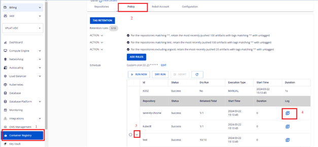 Bước 1 : Tại menu FPT Portal > Container Registry > Policy > Click vào một Retention run để xem chi tiết một task run