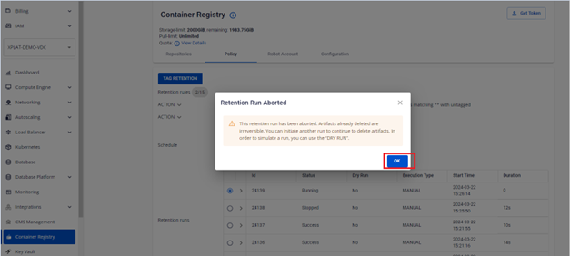 Người dùng có thể Abot một Retention đang Running thực hiện như sau: Bước 1 : Tại menu FPT Portal > Container Registry > Policy > click retentions đang Running > ABORT