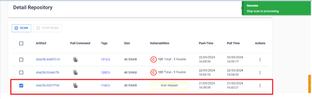 Bước 1 : Tại menu FPT Portal > Chọn Container Registry > Repository > Detail RepositoryBước 2 : Tích chọn Artifact đang Scanning để hiển thị button STOP SCAN Bước 3 : Kết quả sau khi Stop Scan