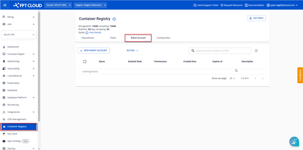 Để tạo mới một Robot Account , bạn cần thực hiện các thao tác sau: Bước 1 : Trên menu FPT Portal chọn Container Registry. Chọn tab Robot Account Bước 2 : Chọn NEW ROBOT ACCOUNT. Nhập thông tin để khởi tạo một Robot Account Trong đó:
