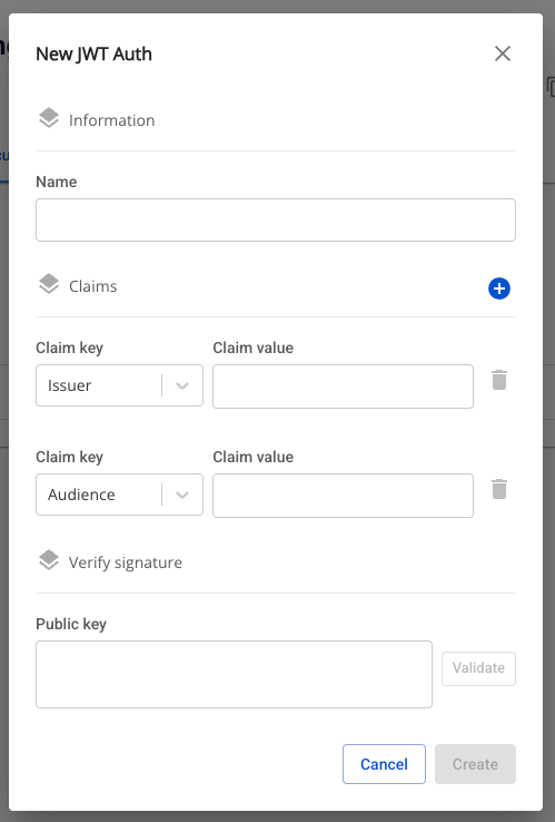 Để tạo mới Security, người dùng thực hiện các bước sau: Bước 1: Tại thanh menu chọn Integration > chọn Event Gateway Bước 2: Tại danh sách Event Gateway > chọn Event Gateway > chọn tab Security Bước 3: Tại danh sách Security > chọn Create > hiển thị popup New JWT Auth Bước 4 : Tại popup New JWT Auth , nhập các thông tin: