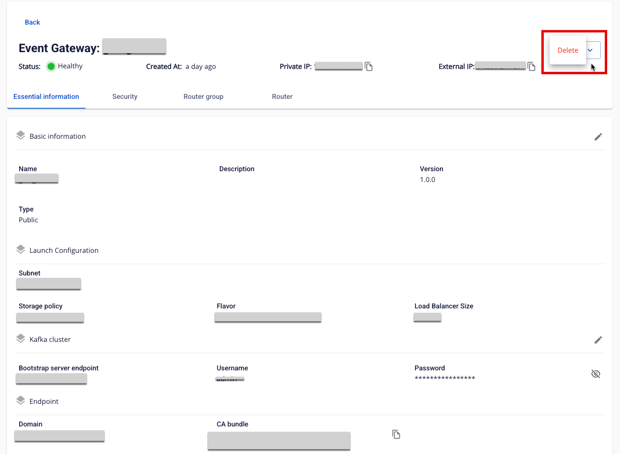 Để xóa Event Gateway, người dùng thực hiện các bước sau: Bước 1: Tại thanh menu chọn Integration > chọn Event Gateway Bước 2: Tại danh sách Event Gateway > chọn Event Gateway cần xóa > nhấn Action > chọn Delete Hình ảnh Bước 3 : Hiển thị hộp thoại Delete Application > nhập delete > nhấn confirm để xóa hoàn thành việc xóa Event Gateway Hình ảnh