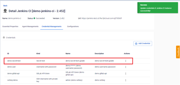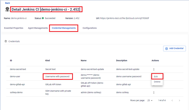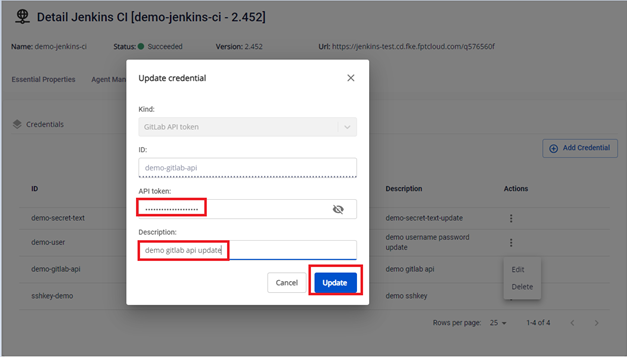 Bước 2. Tại màn Credential Managements > Chọn credential loại GitLab API token cần Edit > Actions Edit :