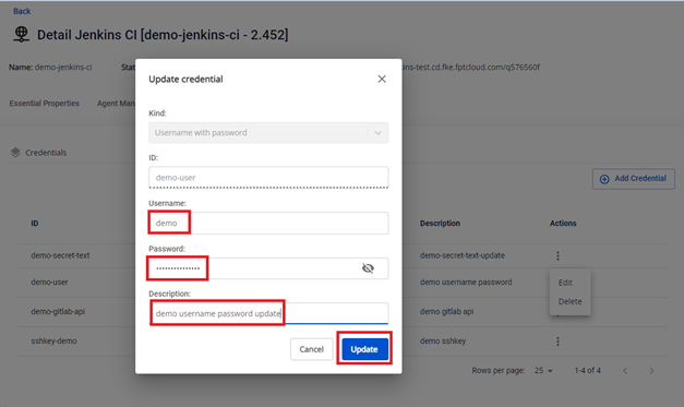 Bước 2. Tại màn Credential Managements > Chọn credential loại Username with password cần Edit > Actions Edit :