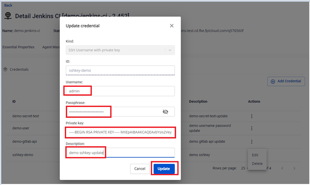 Bước 2. Tại màn Credential Managements > Chọn credential loại SSH Username with private key cần Edit > Actions Edit :