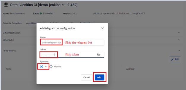 Bước 1. Tại menu FPT Portal > Jenkins CI > Detail Cluster > Configurations > Telegram Bot > Chọn Edit: Alt text Bước 2. Thực hiện cấu hình Telegram Bot: Alt text Alt text Bước 3. Kết quả sau khi cấu hình Alt text Kiểm tra kết quả dưới Jenkins: Alt text