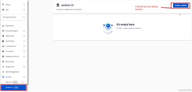 Bước 2. Nhấn chọn Create a Jenkins > Nhập thông tin để khởi tạo một Jenkins CI instance: