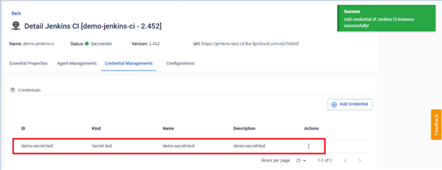 Bước 2. Tại màn hình Credential Managements > Add Credential , thực hiện thêm mới một credential loại Secret Text : Bước 3. Nhập thông tin để tạo credential với kind Secret Text: Bước 4. Nhấn Add để tạo một credential với kind Secret Text. Kết quả sau khi tạo credential: Kết quả tạo credential dưới Jenkins instance: