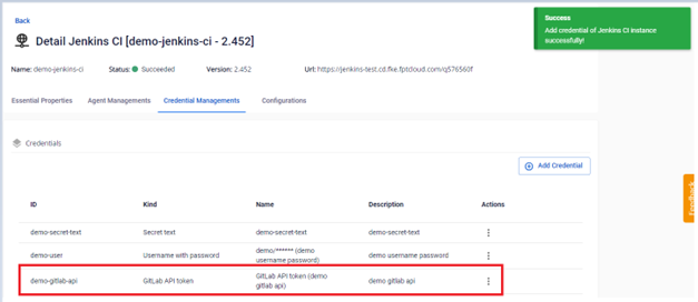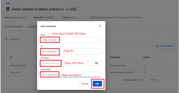 Bước 2. Tại màn hình Credential Managements > Add Credential , thực hiện thêm mới một credential loại GitLab API token : Bước 3. Nhập thông tin để tạo credential với kind GitLab API token : Bước 4. Nhấn Add để tạo một credential với kind GitLab API token. Kết quả sau khi tạo credential: Kết quả tạo credential dưới Jenkins instance: