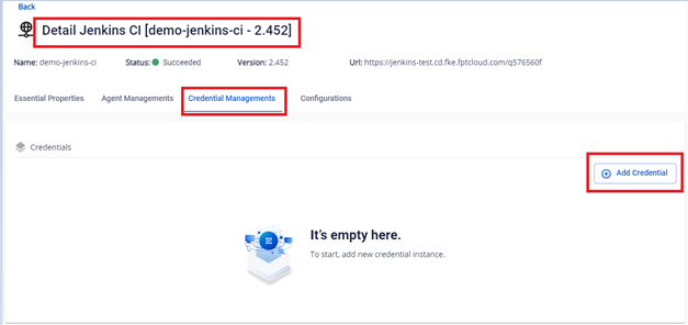Với mỗi loại credential, người dùng có thể thực hiện cấu hình như sau: Bước 1. Tại menu FPT Portal > Jenkins CI > Detail Cluster > Credential Managements :