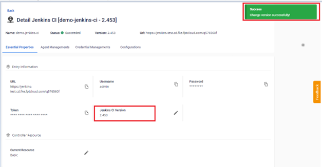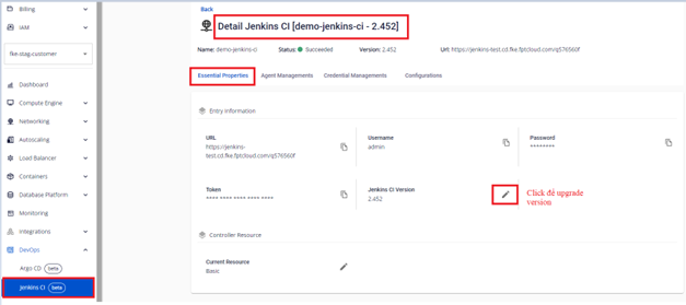 FPT Cloud hỗ trợ người dùng upgrade phiên bản Jenkins lên phiên bản mới hơn trong số các phiên bản FPT Cloud support. Hiện tại trên Portal đang support một số phiên bản bao gồm: 2.452,2.453,2.454. Bước 1. Vào menu Essential Properties > Instance Information Bước 2. Thực hiện chọn version muốn upgrade: Bước 3. Nhấn update để thực hiện Upgrade version. Bước 4. Kết quả sau khi upgrade version thành công Lưu ý: Hệ thống sẽ mất một khoảng thời gian để upgrade version.