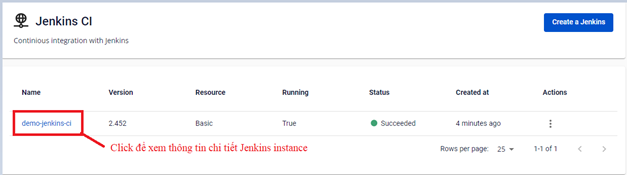 Để làm việc với cụm Jenkins đã được khởi tạo, đầu tiên bạn vào xem thông tin chi tiết của cụm đã được khởi tạo.