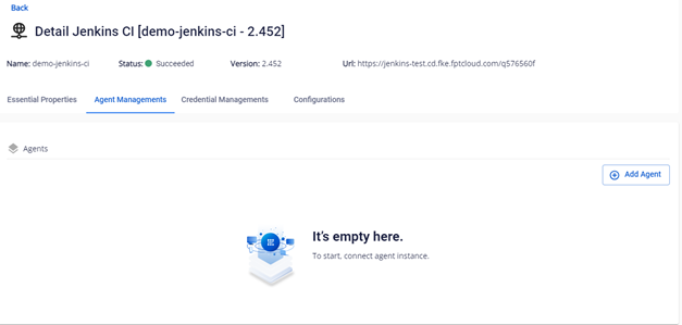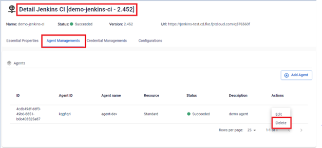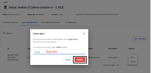 Để xoá một Agent không sử dụng, người dùng thực hiện như sau: Bước 1. Tại menu FPT Portal > Jenkins CI > Detail Cluster > Agent Managements > Click Actions đối với agent muốn cập nhật: Bước 2. Chọn Delete để thực hiện xoá Agent: Bước 3. Trong màn confirm delete, nhập delete và nhấn confirm để xoá agent: Bước 4. Kết quả sau khi xoá agent Trên Portal không hiển thị thông tin agent: Thông tin agent dưới Jenkins cũng bị xoá: