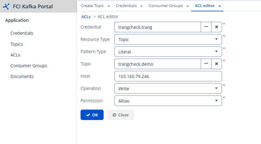 ACLs help users assign permissions, limiting the operations of principals on each topic or group. The permissions include Write, Read, from different IP addresses. To create ACLs, follow these instructions: Step 1 : From the menu, navigate to Application > ACLs. Click Create Step 2 : Enter the necessary information: