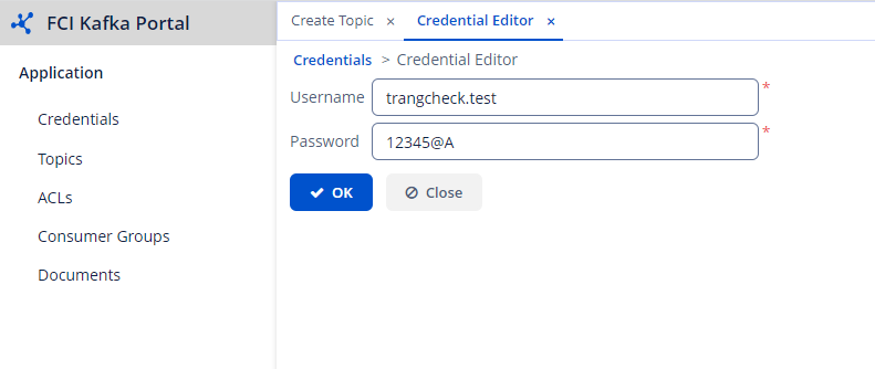 Note : Initially, the system will auto-generate a password. You can reset the password if needed. Step 3 : Click OK to create the credential. Note : The topic name must follow the format [prefix].[credential name]