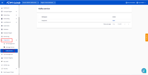 To create a new Kafka account, you need to be allocated with service quota. Contact us for more detail. Step 1 : From the FPT Cloud Portal menu, select Integrations > Kafka Service. Step 2 : Click Create > Enter the workspace name. Step 3 : Click Create. The system will initialize the service and provide processing status notifications. After successfully creating the account, users will be automatically redirected to the Kafka Service administration page. Alternatively, you can access the Kafka Service administration page by navigate to the Kafka Service page and click Start on the instance you would like to access.