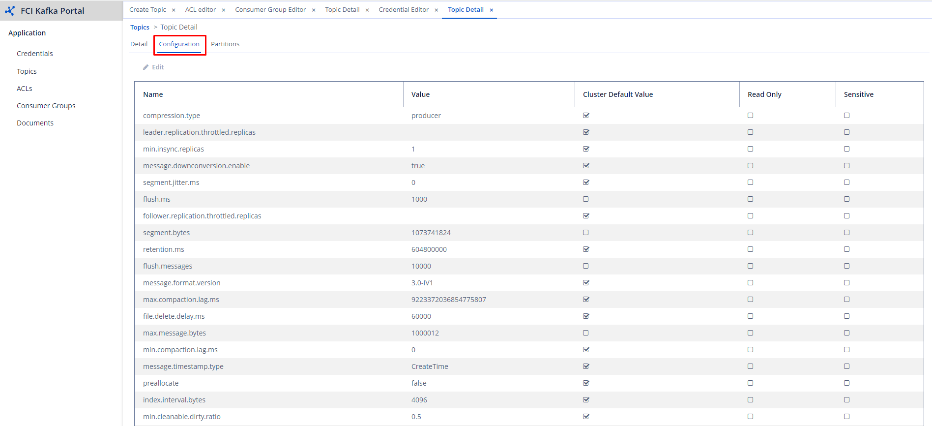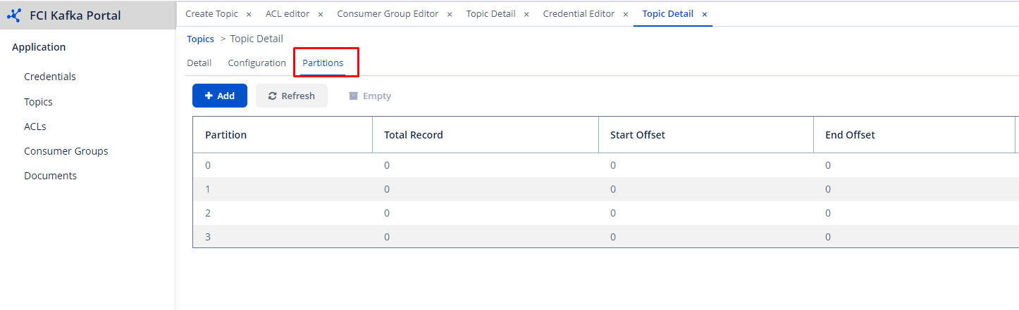 - Partition tab: List the information of the partitions in the topic, including the number of records in each partition, start offset, end offset, etc.