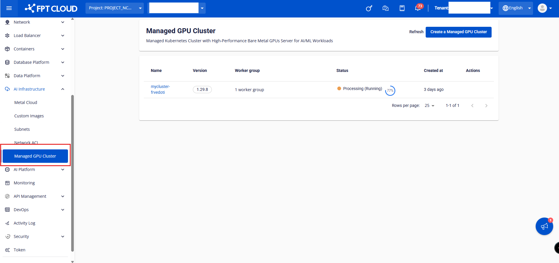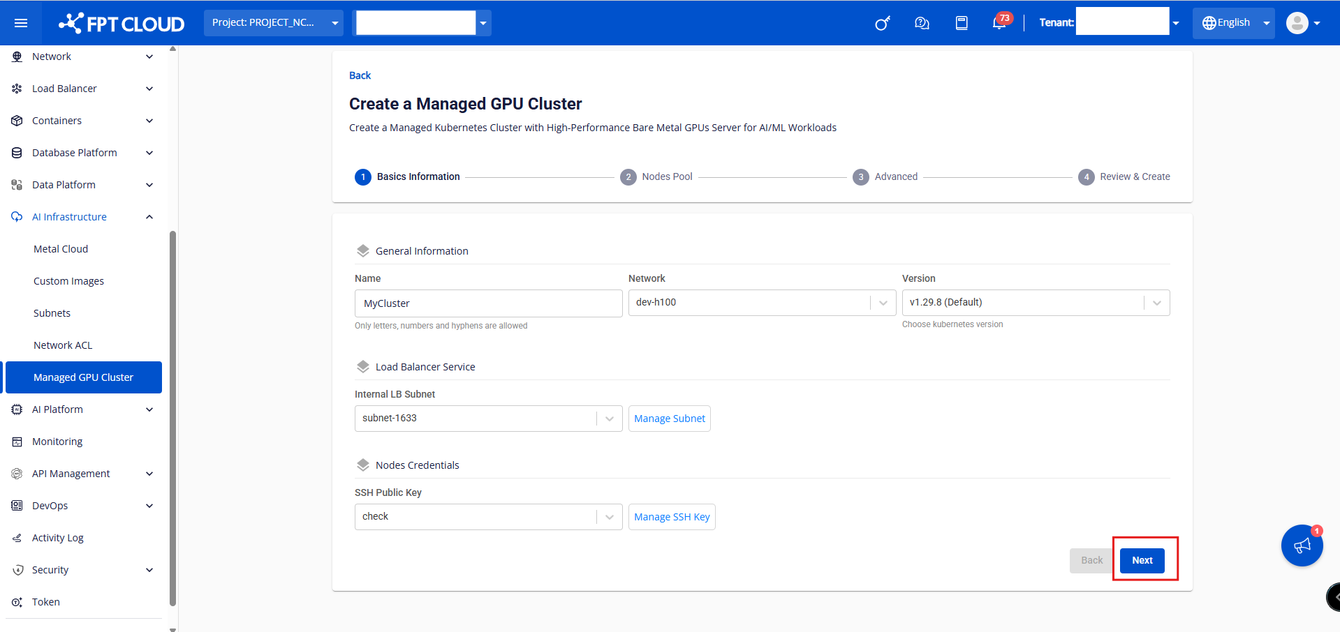 Lưu ý : Một số điều kiện bắt buộc để thực hiện thao tác này: Quota Metal Cloud (Bare Metal HPC) phải đáp ứng đủ số lượng mong muốn của Cluster. Ít nhất 01 BM server Network Ít nhất 01 Network cho Load Balancer Bước 1 : Trên menu của FPT Portal chọn AI Infrastructure > Managed GPU Cluster > Create a Managed GPU Cluster. Bước 2 : Nhập thông tin tại tab General Information của cụm Cluster sau đó click button