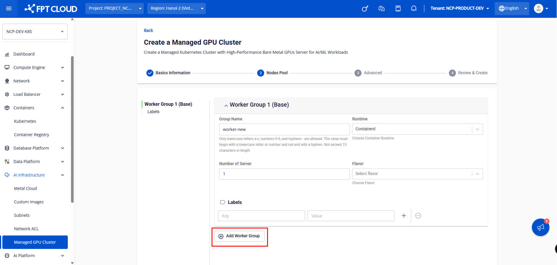 Worker group 1 (Base) : • Group Name : Đặt tên cho Worker Group để phân biệt các Worker Group với nhau. • Runtime : Chọn container runtime, hiện tại, hệ thống mới chỉ hỗ trợ container runtime Containerd. • Number of Server : Số Metal Cloud Server được tạo ra để chạy Worker trong Cluster. • Flavor : Flavor type của Metal cloud GPU server, mặc định là H100. • Label : Đánh Label trong Kubernetes cho tất cả Worker trong Worker Group Người dùng có thể thêm các worker group khi khởi tạo k8s cluster bằng cách click button ADD WORKER GROUP. Ngoài ra, từ Worker Group 2 trở đi người dùng có thể cấu hình taint cho các worker group nhằm mục đích schedule ứng dụng trên các worker nodes. Các taint cũng có thể thêm, xóa, chỉnh sửa dễ dàng. Lưu ý : Người dùng khi cấu hình label/taint cho worker group trên Unify Portal sẽ không thể xóa label/taint cho node trong worker group đó bằng kubectl (Hệ thống sẽ tự động thêm lại label/taint cho node theo cấu hình trên Unify Portal) do đó cần xóa cấu hình label/taint trên Unify Portal. ➤ Worker Group n : Người dùng có thể thêm các Worker Group khi khởi tạo K8s Cluster bằng cách nhấn button ADD WORKER GROUP. Ngoài ra, từ Worker Group 2 trở đi người dùng có thể cấu hình taint cho các Worker Group nhằm mục đích schedule ứng dụng trên các Worker nodes. Các taint cũng có thể thêm, xóa, chỉnh sửa dễ dàng. Tìm hiểu thêm về Taints tại đây Lưu ý : Người dùng khi cấu hình label/taint cho Worker Group trên Portal sẽ không thể xóa label/taint cho node trong Worker Group đó bằng kubectl (Hệ thống sẽ tự động thêm lại label/taint cho node theo cấu hình trên Portal) do đó cần xóa cấu hình label/taint trên Portal. Bước 4 : Phần Advanced là các cài đặt nâng cao • Pod Network : Network sử dụng cho Pod trong Cluster. • Service Network : Network sử dụng cho Service trong Cluster. • Network Node Prefix : Số Pod tối đa trên mỗi Managed GPU Node. • Max Pod per Node : Loại CNI được cài cho Cluster, chỉ hỗ trợ loại Calico Bước 5: Màn hình Review & Create sẽ hiển thị các thông tin cụm Cluster người dùng đã cấu hình trước đó và hệ thống tự động kiểm tra quota Bare Metal GPU server có đủ để khởi tạo Cluster hay không Sau khi hệ thống kiểm tra tài nguyên thành công, nhấn button Create a Managed GPU Cluster để tiến hành tạo cụm Cluster.