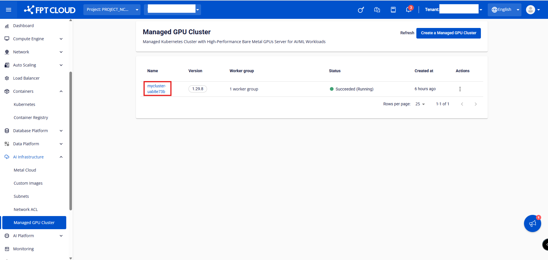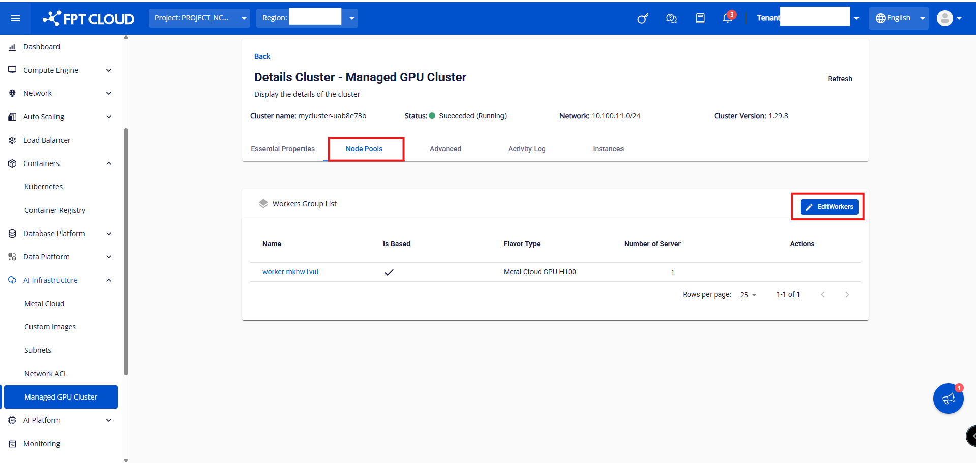 Khi người dùng có mong muốn thay đổi Worker Group base, các thành phần của hệ thống (coredns, metrics servers, CNI controller, …) sẽ được triển khai lại trên các Worker nodes thuộc Worker Group base mới. Tính năng này mang lại lợi ích trong trường hợp người dùng muốn tăng/giảm cấu hình flavor của các Worker nodes trong Worker Group base, khi đó người dùng tạo Worker Group mới với cấu hình Worker nodes mong muốn, chuyển Worker Group mới đó thành base và xóa Worker Group base cũ. Bước 1 : Ở menu chọn AI Infrastructure > Managed GPU Cluster , hệ thống sẽ hiển thị trang Managed GPU Cluster Management. Chọn Cluster muốn thay đổi cấu hình Worker Group. Bước 2 : Chọn Node Pools > Edit Workers. Bước 3 : Chọn Worker Group muốn thay đổi và click button Save. Lưu ý :
