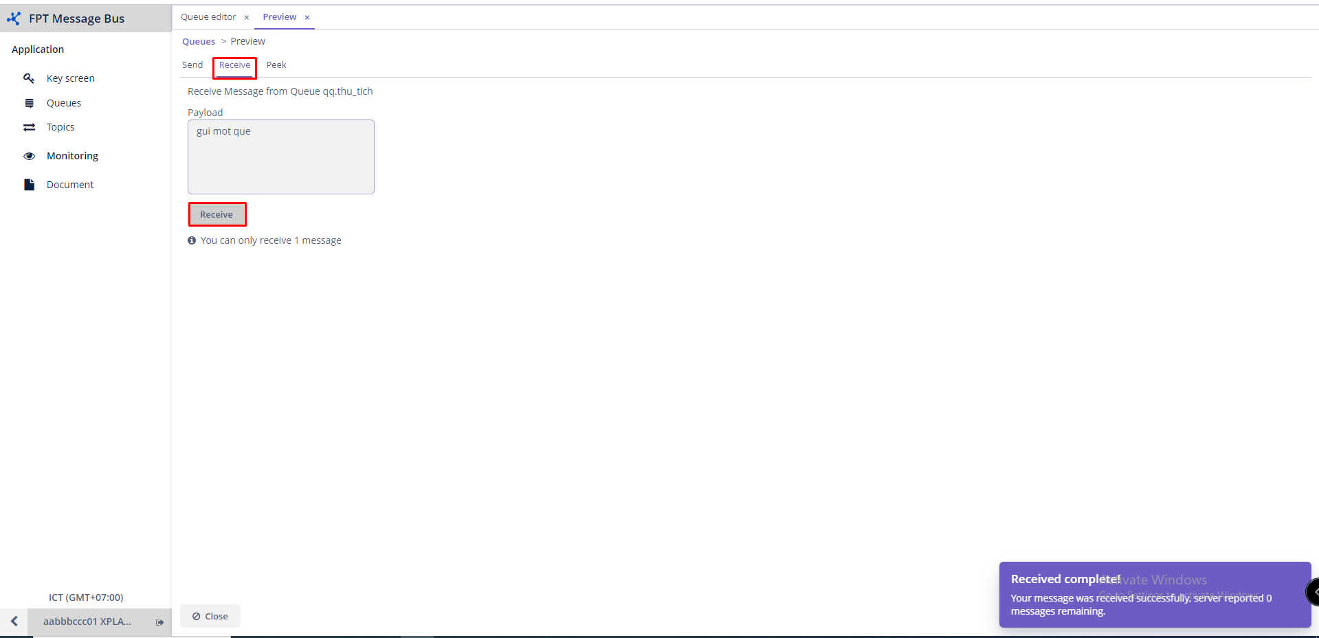 Bước 3 : Chọn nút Send để gửi Lúc này bạn đã publish messages thành công vào hàng đợi. Để có thể nhận messages, bạn thực hiện như sau: Bước 1 : Bạn vào tab Receive > Sau đó chọn nút Receive.