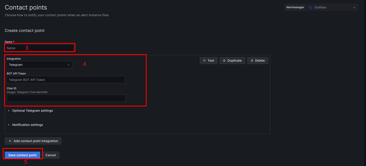Để tạo tích hợp Telegram trong Grafana Alerting, thực hiện các bước sau: