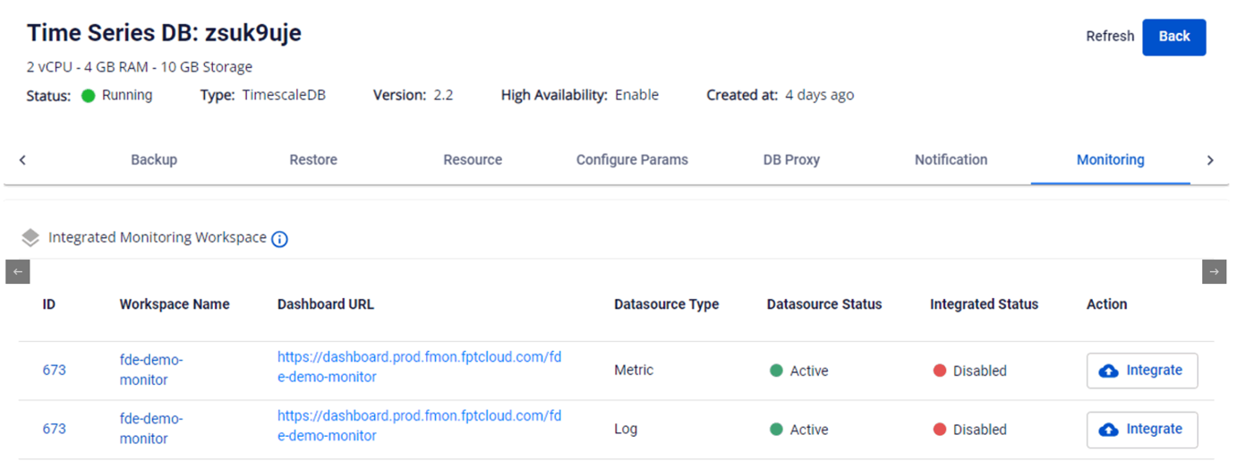 • Sau khi tích hợp giám sát thành công (Integrated Status = "Enabled"), click vào Dashboard URL để đi tới trang Grafana