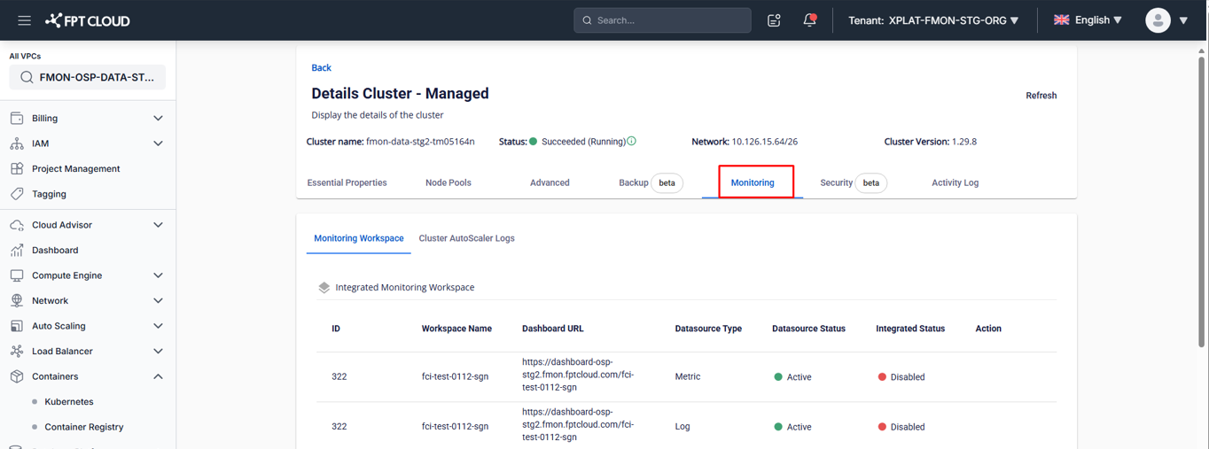 - Sau khi tích hợp thành công, Integrated Status sẽ chuyển sang "Enabled", hệ thống FPT Monitoring bắt đầu thu thập các chỉ số tương ứng.