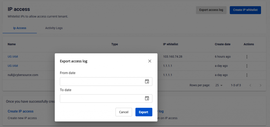 • Bước 1: Trên trang IP access, bấm "Export access log".