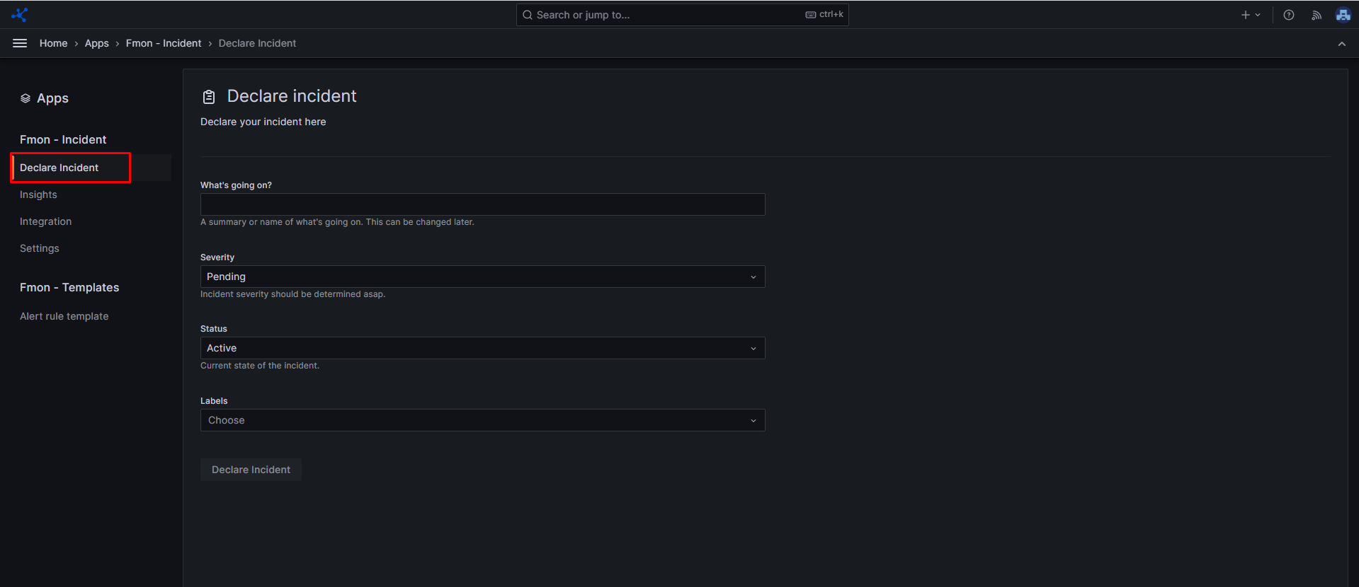 Step 1 : From the sidebar menu, choose Apps , then click FMON - Incident Step 2 : Click Declare Incident Step 3 : Enter the necessary information for the incident: