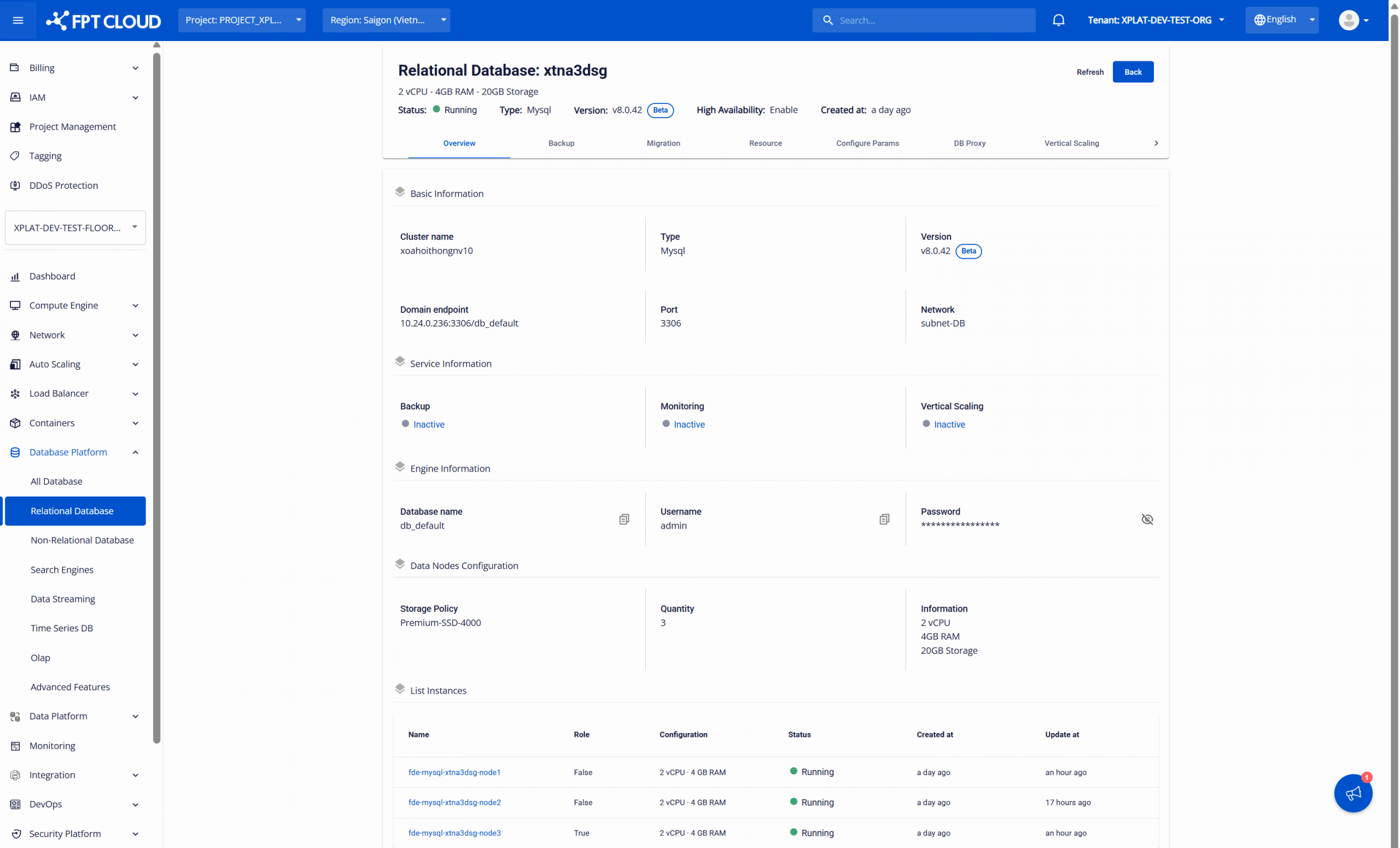 To view database cluster details, log in to the FPT Console Portal, then navigate to Database Platform > All Database. Select the Cluster ID of the target database cluster and open the Overview tab to access the detailed information page.