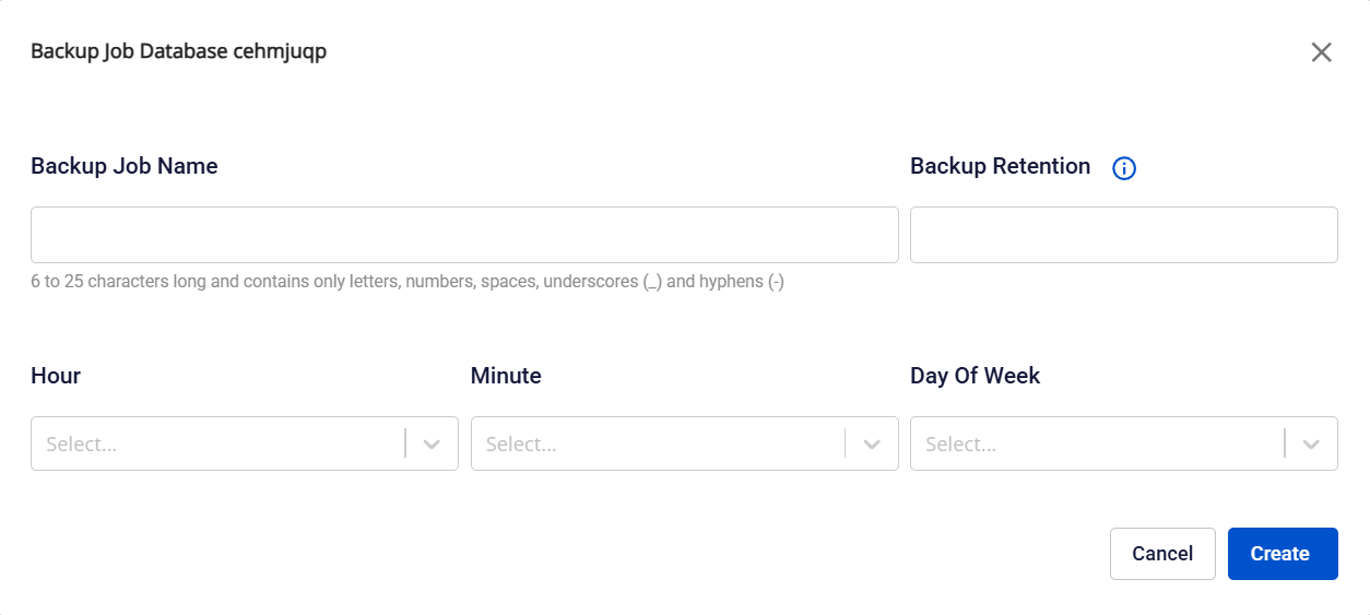 • Hour / Minute / Day of Week : Thiết lập lịch chạy backup (giờ, phút, ngày trong tuần). Lưu ý : Đối với engine Kafka, thao tác backup có thể gây gián đoạn tạm thời. Bạn nên lên lịch chạy backup vào khung thời gian ít tải để hạn chế ảnh hưởng đến dịch vụ.