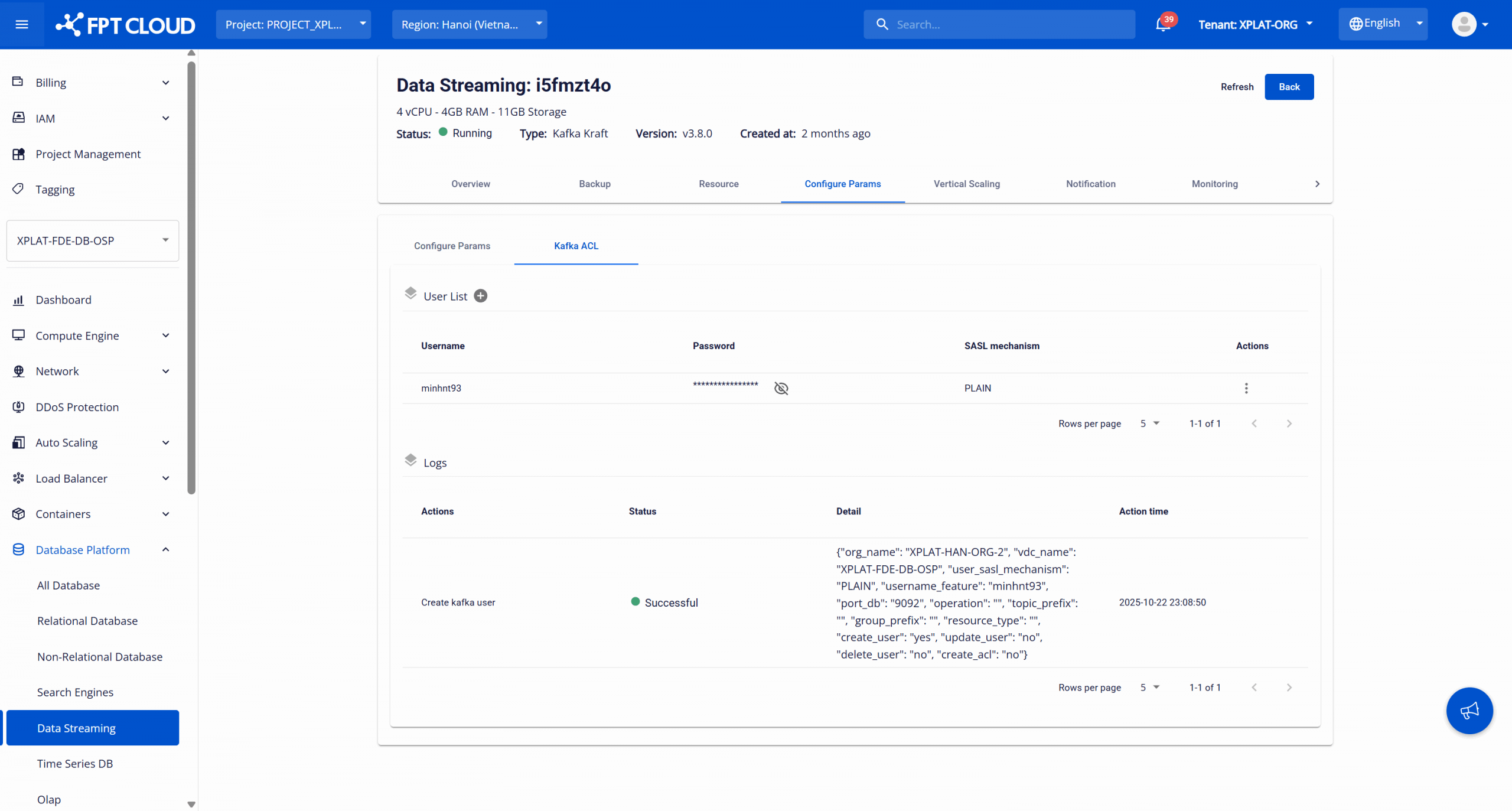 Đăng nhập FPT Cloud Console. Chọn “Database Platform ” > “Data Streaming ” > nhấp vào cluster ID của cụm Kafka để mở trang chi tiết. Chọn tab “Configure Params ” > chọn sub-tab “Kafka ACL ”. Trang quản lý Kafka user hiển thị như sau: Mục “User List ” hiển thị toàn bộ Kafka user đã được cấu hình trên cluster. Thông tin hiển thị gồm: