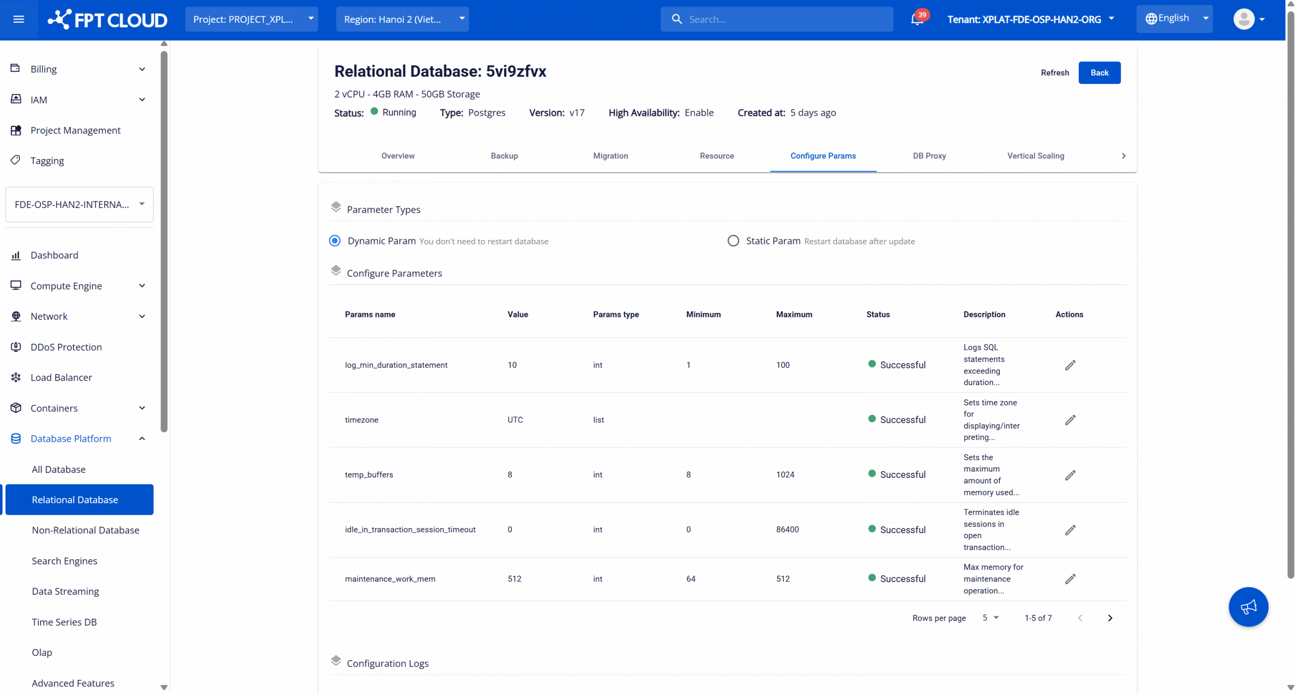 Đăng nhập FPT Cloud Console. Mở trang Database list > chọn ID của cụm cơ sở dữ liệu để mở trang chi tiết > chọn tab Configure Params để truy cập trang Quản lý Parameter :