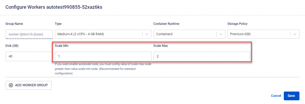 Note: When the maximum worker count is greater than the minimum worker count, the Cluster Autoscale feature will be automatically enabled.
