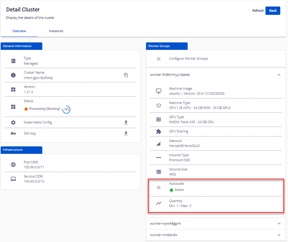 Similar to how Cluster Autoscale with M-FKE works, the Kubernetes cluster will automatically increase/decrease the amount of Worker Node in a Worker Group depending on the GPU usage: adding new Worker Node in a Worker Group if the application running on that worker group doesn't receive sufficient resources (GPU) from the nodes in that pool. The pending Pods will be allocated to the newly created Worker Nodes after scaling. Cluster Autoscale will also remove nodes that do not meet the utilization requirements (defaults to 50% utilization) for that node.