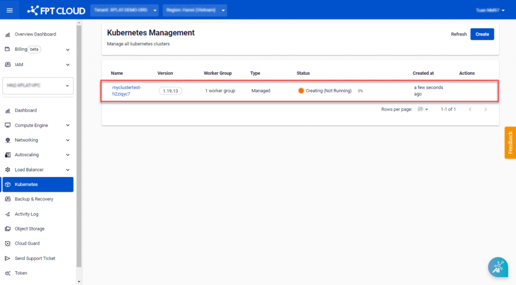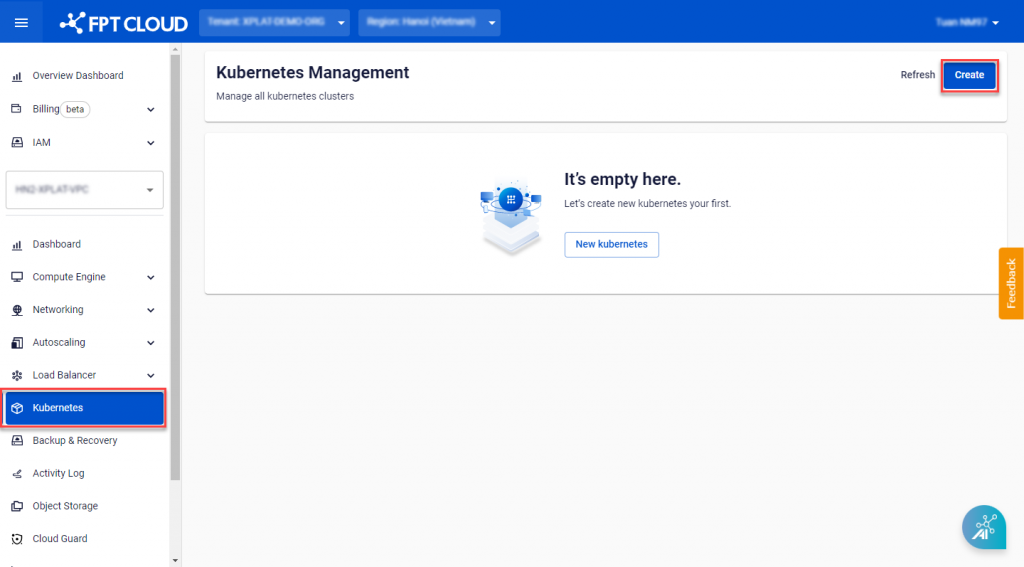Step 1 : In the FPT Portal menu, select Kubernetes > Create.