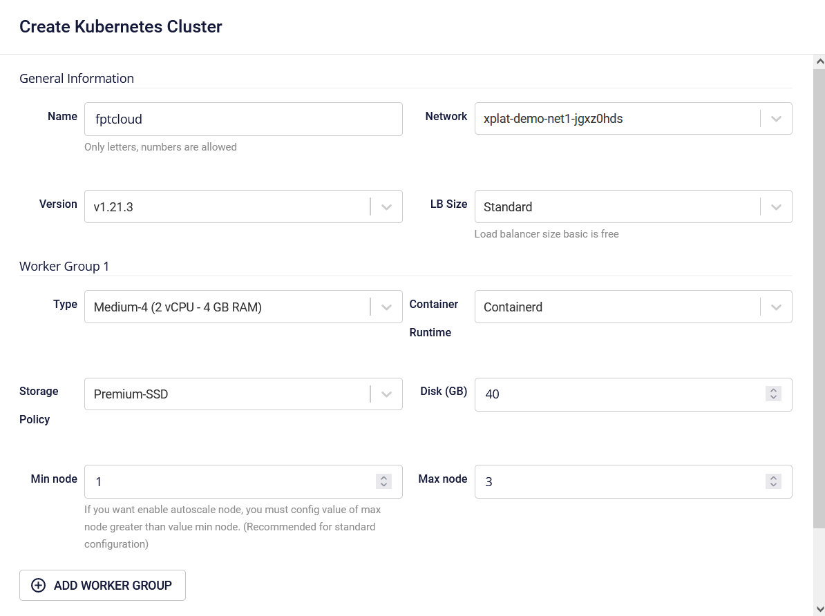 - Min Node : The minimum number of VM instances for the Worker Node in the K8s cluster. It is recommended to have at least 03 Nodes for a production environment.