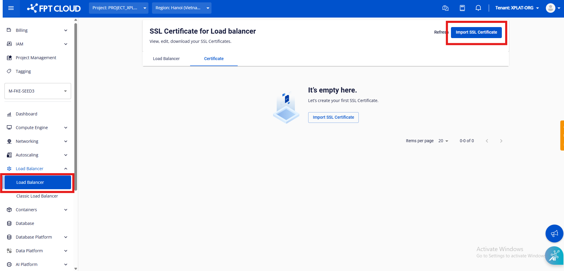 Bước 1 : Truy cập vào Tab Load Balancer , bấm Import SSL Certificate để tạo cert mới