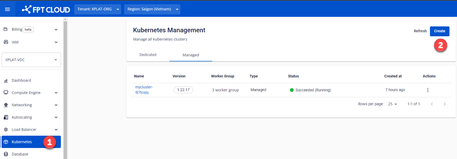 Step 1 : Login to the FPT Cloud Portal. From the sidebar menu, choose Kubernetes > click Create
