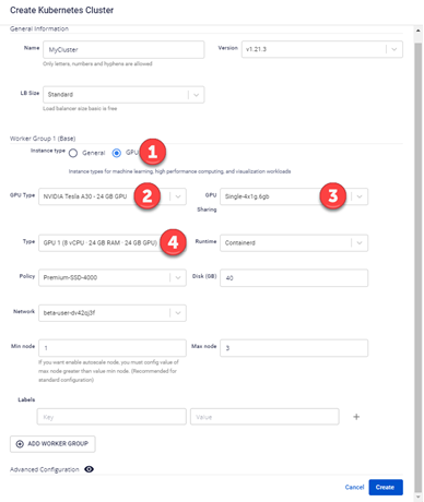 Step 2 : Enter the specification for the desired Kubernetes Cluster. Besides the normal information for the cluster, select GPU specs in the Worker Group: