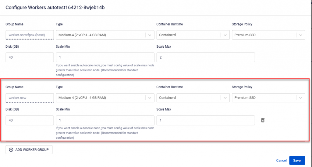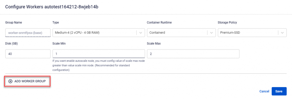 - Scale Min : The minimum number of VM instances for the Worker Node in the K8s cluster. It is recommended to have at least 03 Nodes for a production environment.